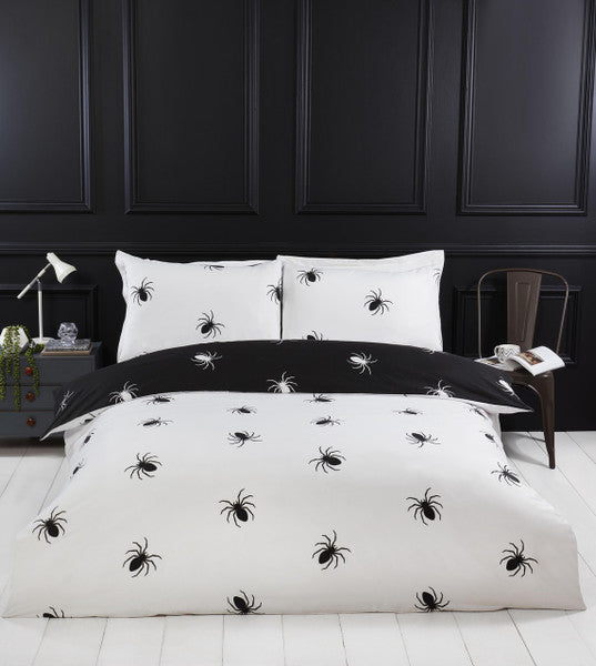 Introducing our spellbinding Gothic Halloween bedding set where elegance meets the eerie allure of the night. Embrace the dark beauty of the season with this simple but striking black and white spider-inspired design, meticulously crafted to infuse your bedroom with a hauntingly captivating ambiance. Fully reversible.