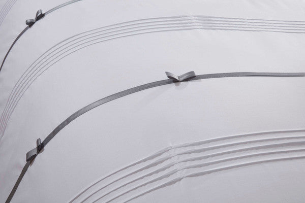 Clarissa duvet set is a contemporary and opulent design. Pintuck detailing alongside contrasting ribbon in charming little bows.