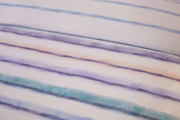 Refresh your bedroom with the Horizon Duvet Cover Set, featuring a calming watercolour stripe design. The subtle yet stylish pattern showcases horizontal brushstroke-effect stripes in soft shades of blue, teal, purple, and warm orange, creating a serene and contemporary aesthetic. This reversible duvet set offers two versatile looks-one side features bold, colorful stripes, while the reverse presents a lighter, minimalist version with delicate blue lines on a white background.